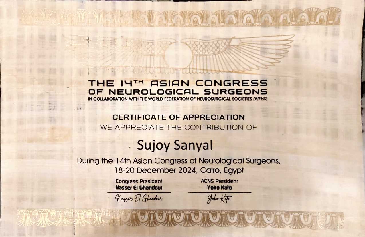 Dr Sanyal was one of 34 selected from all over India to do medical schooling (MBBS) at the All India Institute of Medical Sciences, New Delhi, which is the premier medical institution of India. Immediately thereafter, he joined an Integrated 5-year Neurosurgical M.Ch position at the same institution which had only one vacancy every year during his time. He thereafter did extensive Fellowship Training in the USA/Canada which made him India’s First Fellowship-trained Vascular-cum-Endovascular Neurosurgeon.